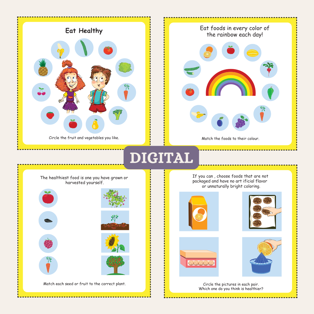 These worksheets are playful journey into the world of health and wellness. We cover everything – from what foods are good for us, to the importance of hygiene, movement, hobbies, and even methods for relaxation and rest.